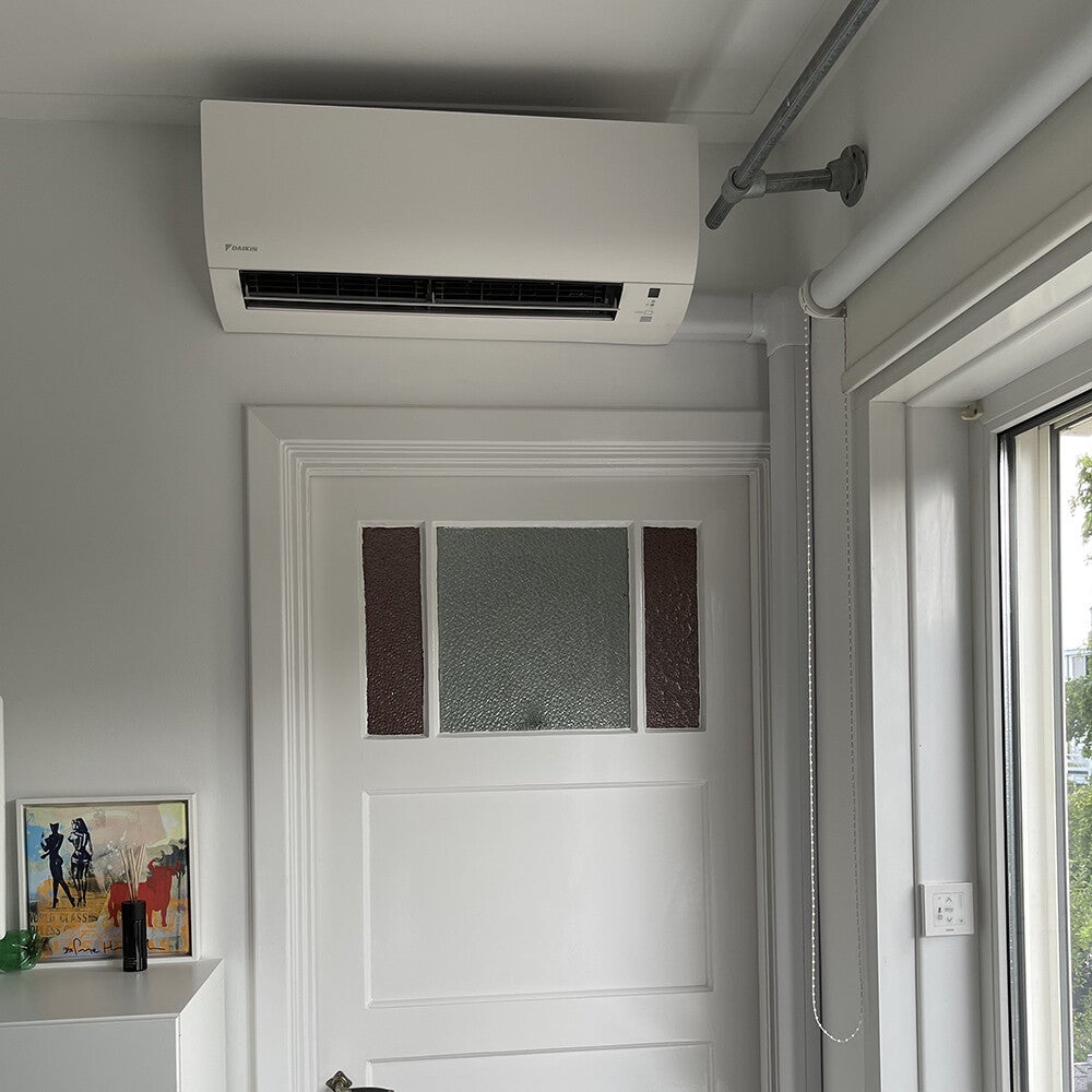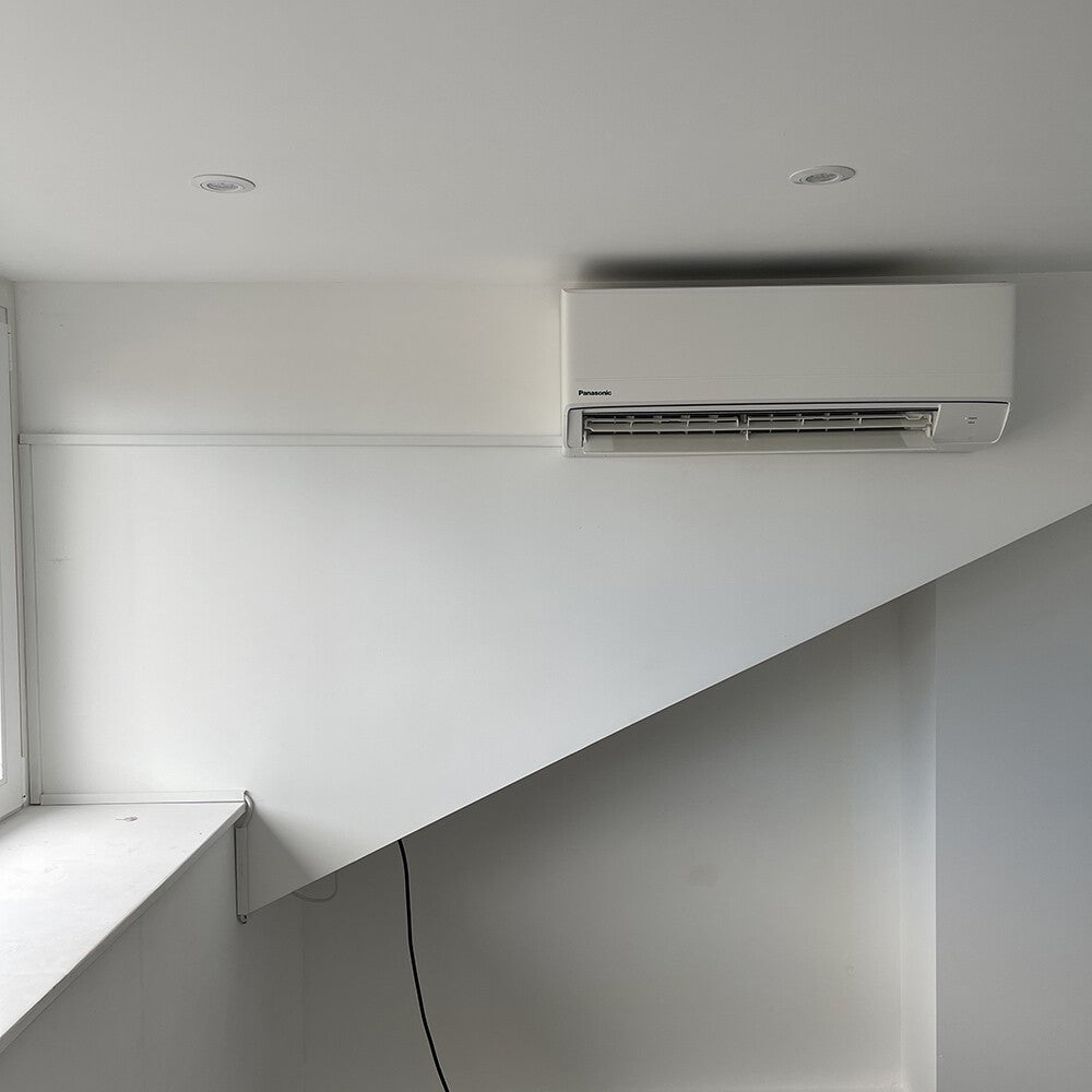 Een strakke plaatsing in de hoek van de ruimte maakt dat de airconditioning niet te prominent aanwezig is.